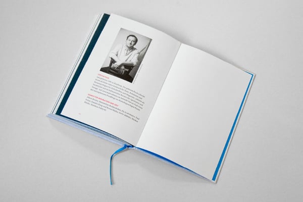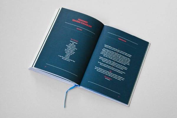 Begegnet man dem Buch in einer Buchhandlung, leuchten die drei Pantone-Farben auf dem Umschlag kräftig, Titel und Motiv ergänzen sich, getragen vom Resopal-Untergrund, der den Betrachter gedanklich gleich in die Küche versetzt. Durch die Prägung des Titelschriftzugs im Feinleinen lädt das Buch auch haptisch zum Entdecken ein. Schlägt man es auf, überrascht das strahlend blaue Vorsatzpapier. Beim Blättern wird schnell klar: Die Geschichten sind klassisch gesetzt, schwarze Serifenschrift (übrigens thematisch passend die Schriftart Vollkorn) auf gebrochen weißem Naturpapier mit großzügigem Weißraum – optimale Lesbarkeit. Die Kapiteleinleitungen greifen den Resopaluntergrund des Titels auf, ebenso die fette, prägnante Schrift. Am Ende der Geschichte leuchten weiße und rote Worte aus der dunkelblauen Fläche heraus – so sind die Rezepte sofort zu finden. Ein blaues Lesebändchen, passend zum Vorsatzpapier und Titel, hilft außerdem, die Seite nicht zu verlieren, ob beim Lesen oder Zubereiten. Der Druck mit drei Farben im Innenteil erlaubt uns Spielereien wie rote Seitenzahlen und Überschriften – so werden die zur Verfügung stehenden Produktionsmittel maximal genutzt, die Investition soll sich ja lohnen. Funktionalität und Spielerei formen dieses Buch, das mehr ist als nur Buchstaben auf Papier.