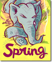 Acht deutsche SPRING-Zeichnerinnen haben in einer Schriftstellerresidenz nahe Bangalore acht ihrer indischen Kolleginnen getroffen und mit ihnen gemeinsam die aktuelle Ausgabe des SPRING-Magazins erarbeitet. In den Comics und Zeichnungen erzählen sie vom Leben als Frau in unterschiedlichen Kulturen, von Vorbildern, offenen Fragen, Sexualität, Stolz, Gewalt und Konflikten. Die Geschichten sind unterhaltsam und dramatisch, persönlich und allgemeingültig. Viele von ihnen drehen sich um einen oft ignorierten Zustand, den kaum einer anzusprechen wagt – "The elephant in the room", wie es im Englischen so schön heißt.