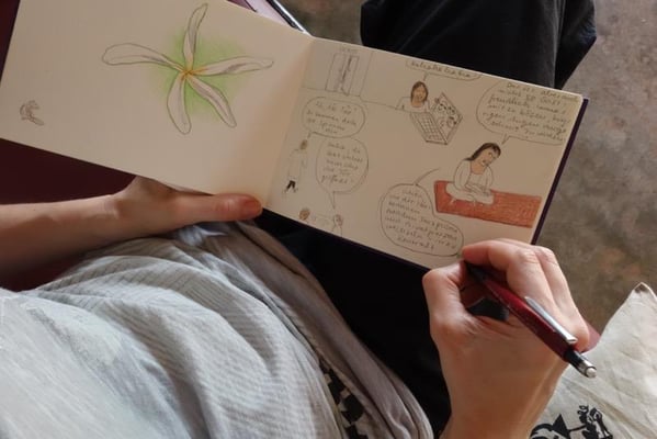 Zu Beginn haben wir einen Zeitplan für alle 10 Tage gemacht und jede hatte die Möglichkeit, einen kleinen Workshop anzubieten. Die ersten Tage gab es nach dem Frühstück eine Art Zeichen-Warm-Up. Von reinen Zeichenübungen bis zu Kreativ- oder Textübungen gab es alles.