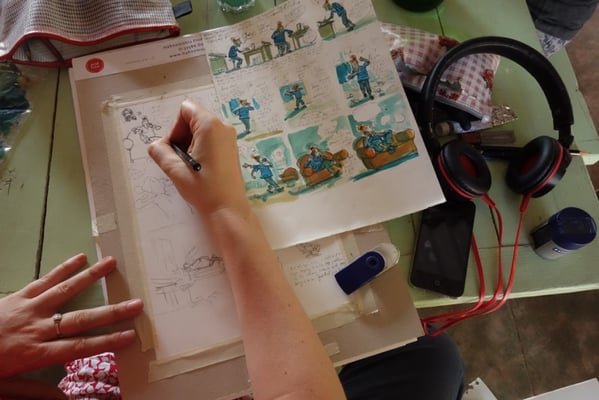 Nach zwei Tagen hatten wir die erste große Besprechungsrunde, in der wir uns gegenseitig die ersten Ideen und Ansätze gezeigt und erzählt haben. Da wir 16 Zeichnerinnen waren, ging das sehr lang und wir mussten das aufteilen. Dann hat sich wieder jede an ihren Arbeitsplatz zurückgezogen. Wer wollte hat das Gespräch zu zweit oder in Kleingruppen gesucht. Wir waren ja auf kleinem Raum zusammen, so dass man immer irgendwo jemanden fand und im Vorbeigehen sehen konnte, was sie gerade macht.