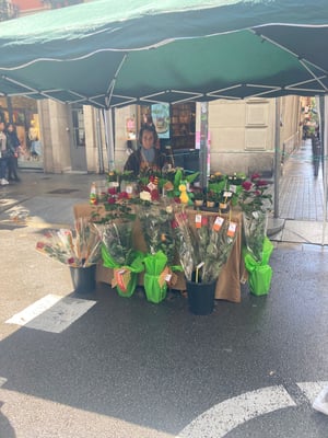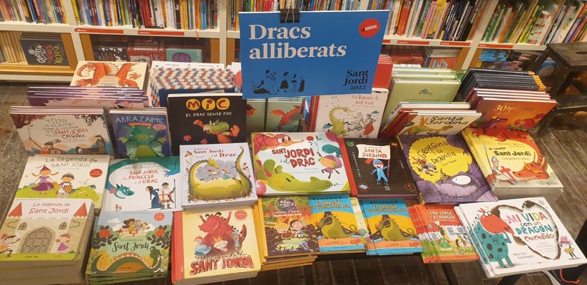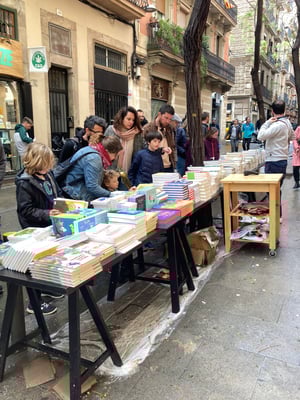 Sant Jordi ist für die Verlage und Buchhandlungen »wichtiger als das Weihnachtsgeschäft«. Viele machen an diesem einen Tag 20-35 Prozent ihres gesamten Jahresumsatzes. Und obwohl es in Spanien die Buchpreisbindung gibt, bekommen die Kund*innen zu Sant Jordi ausnahmsweise 10 Prozent Rabatt auf Bücher – den sich Verlage und Buchhandlungen hälftig teilen. Bereits die Wochen vor Sant Jordi geht also ein Riesenrummel los – überall stapeln sich riesige Bücherstapel und Berge von Kisten, in den Lagern der Vertriebe kommen dauernd Buchhändler*innen herein und nehmen sich die gewünschten Mengen mit. Ein bisschen fühlt es sich an wie auf einem Großmarkt für Fisch oder Blumen. Wobei Blumen hier auch eine große Rolle spielen.