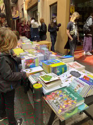 Daher gibt es nun hier das Sant Jordi-Fest. Ursprünglich war es Brauch, dass Männer an diesem Tag den Frauen eine Rose schenken, und Frauen den Männern ein Buch. Zum Glück ist das Ganze inzwischen etwas freier, heute schenken sich alle gegenseitig Bücher und Blumen, auch die Kinder und Familien sind voll dabei.