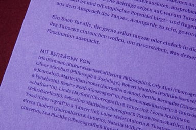Die Herausgeber*innen Maximilian Probst (Journalist und Autor) und Ursina Tossi (Choreograph*in und Tänzer*in) erkunden gemeinsam mit 14 Autor*innen das Philosophische des Tanzens. Sie nehmen